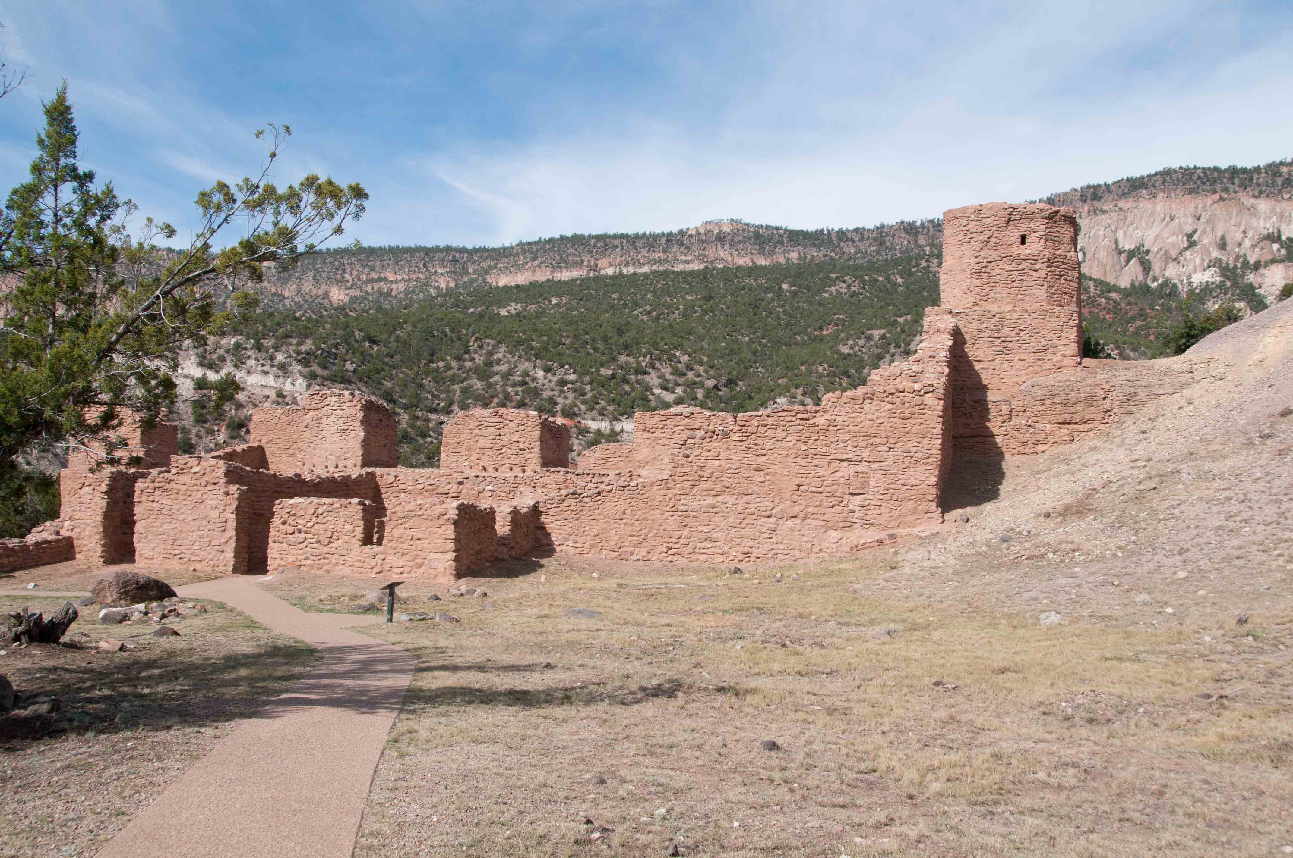 on New Mexico State Road 4 at the north end of Jemez Springs. The site preserves