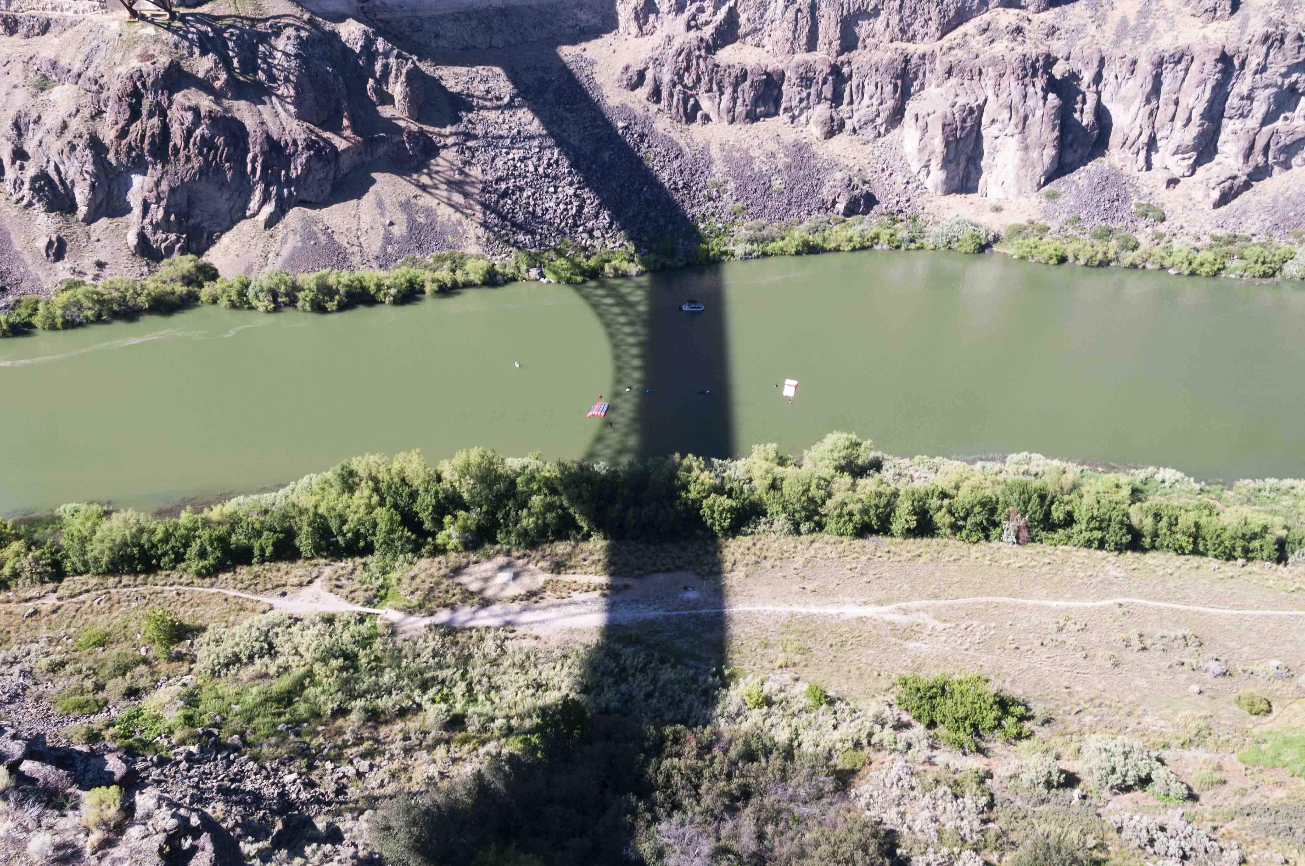 The first stop of a five-day trip to Idaho in July, 2020, was Twin Falls, where we spent the night at the Oregon Trail Campground. This was fortunate, because the campground owner suggested we check out the BASE jumpers on the Perrine Bridge. For those of us unfamiliar with the sport of BASE jumping, is involves launching oneself off a fixed object then deploying a parachute for the landing. BASE stands for the four objects off which a BASE jumper jumps: Building, Antenna, Span (bridge), and Earth (cliff). BASE jumping is one of the more dangerous forms of parachuting because the jump is made from fairly low altitude, the jumper only has one parachute, and the object from which the jump is made can get in the way. Not a sport I will be taking up any time soon.
